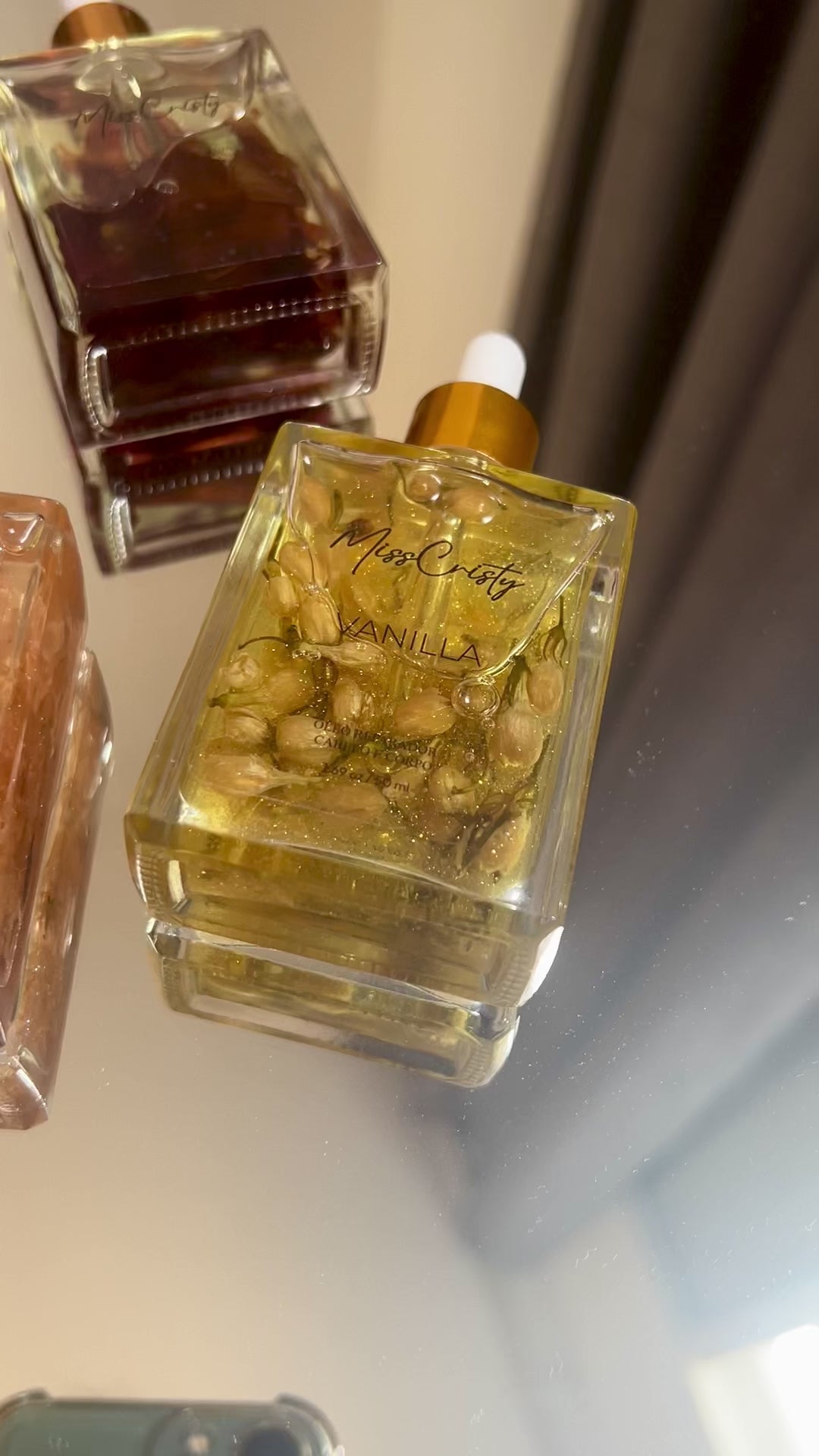 As flores secas dentro do frasco não apenas embelezam o produto, mas também simbolizam a leveza e a delicadeza do autocuidado. Ideal para todos os tipos de pele, pode ser usado após o banho ou como um toque final de brilho e perfume ao longo do dia.